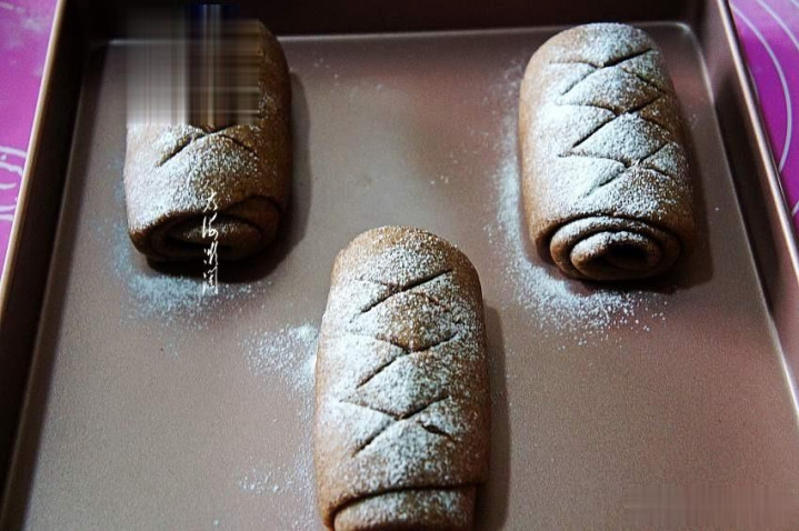 横过来再擀成长卵形的饼,撒些黑加仑干不详葡萄干卷起来,码入烤盘。面包上薄薄地喷洒点水,筛一层薄薄的面粉,用快刀毛糙割几下,送入烤箱二次发酵20分钟傍边。